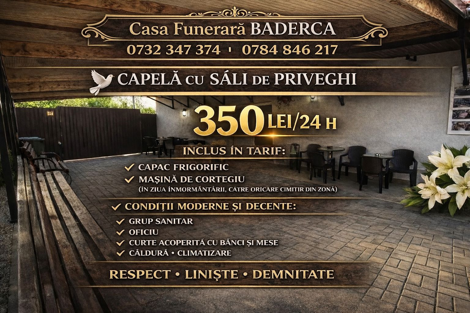 Capelă privată spațioasă, autorizata DSP, cu două camere de priveghi, toaletă, oficiu, curte cu banci si mese, incalzire, climatizare etc